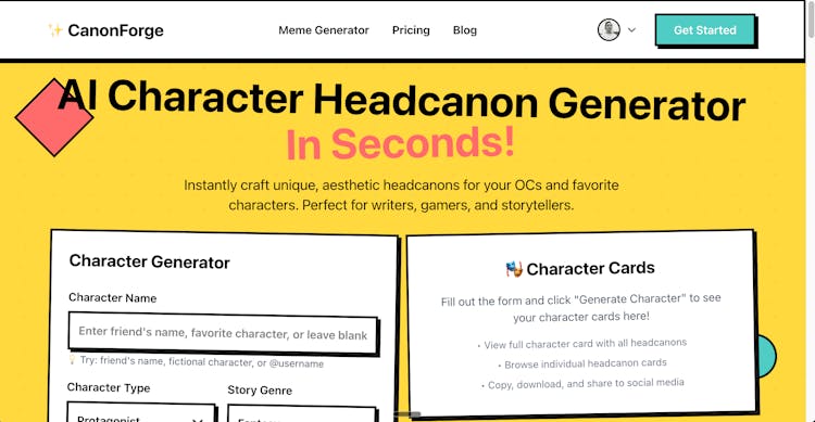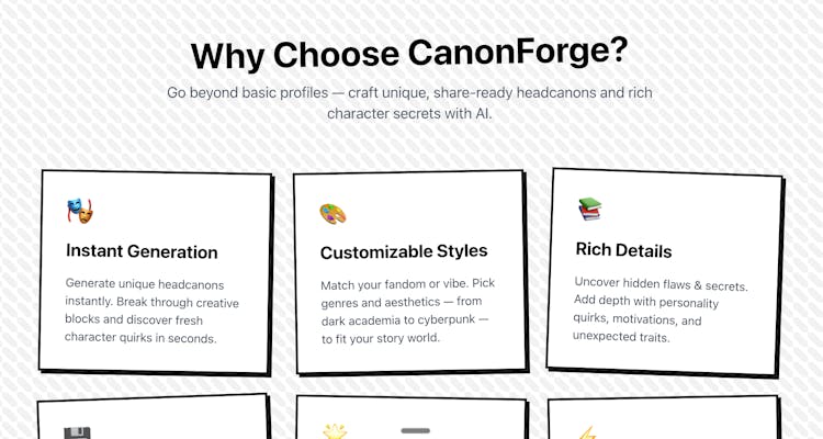 CanonForge instantly generates unique, aesthetic headcanons and character cards for writers, game devs, and storytellers. Customize genres and styles (from dark academia to cyberpunk), surface quirks and hidden backstory, and export share-ready visuals for Discord, Tumblr, or TikTok. Multilingual output and lightning-fast generation help you break creative blocks and ship characters faster. Free headcanon generation with optional one-time credits for image/meme features.