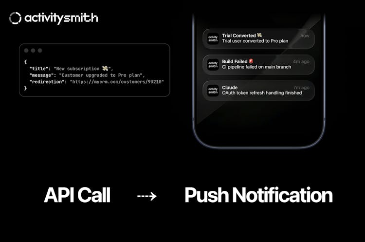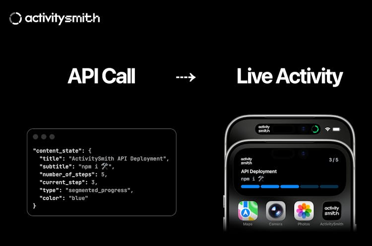 ActivitySmith lets you send Push Notifications and trigger Live Activities from any backend, script, automation or AI agent with a simple API call. Install the iOS app, pair your device(s) with a tap, and use an API key to send updates to your Lock Screen and Dynamic Island.