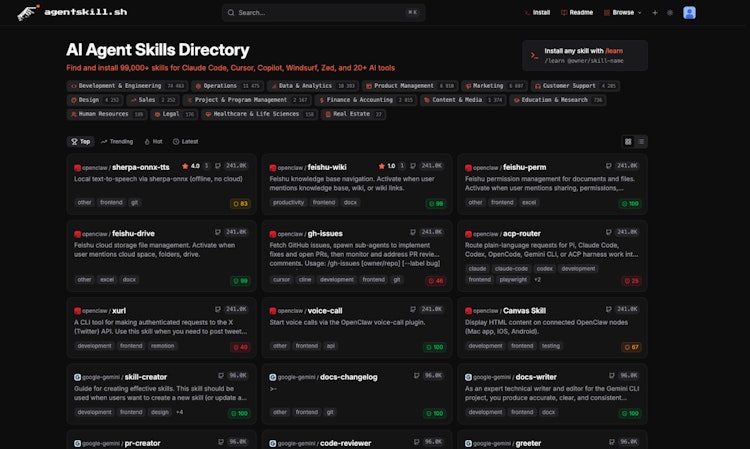 Largest cross-platform directory of AI agent skills. 100K+ skills, 30+ platforms, security audits on every listing. One search, every platform.