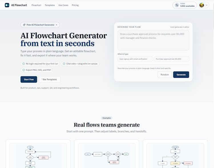 AI Flowchart is an AI-powered flowchart generator that helps users instantly turn plain text into clear, structured, and editable flowcharts. It is designed for students, teams, product managers, developers, analysts, and operations professionals who need a faster way to visualize ideas, processes, SOPs, decision trees, system logic, and workflows without drawing everything manually. Users can paste notes, requirements, step-by-step instructions, pseudocode, or process descriptions, and the tool automatically converts them into professional diagram layouts in seconds. Beyond generation, AI Flowchart also supports interactive refinement through chat-based editing and direct canvas editing, making it easy to adjust structure, wording, branches, and logic after the first draft is created. It works well for brainstorming, documentation, process mapping, internal training materials, project planning, and explaining complex systems visually. The platform is especially useful for quickly creating diagrams from messy text inputs, simplifying communication across teams, and reducing the time normally required in traditional diagram tools. Users can export finished flowcharts in formats like PNG, SVG, and PDF for sharing, presentation, or documentation purposes.