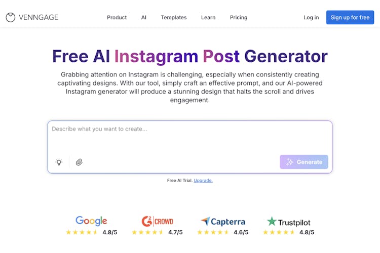 The AI Instagram Post Generator helps marketers, creators, and businesses design high-quality Instagram visuals quickly and consistently. Built with Venngage’s trusted design system and AI capabilities, it simplifies social media creation by combining smart content suggestions with professional design templates—no design experience required.