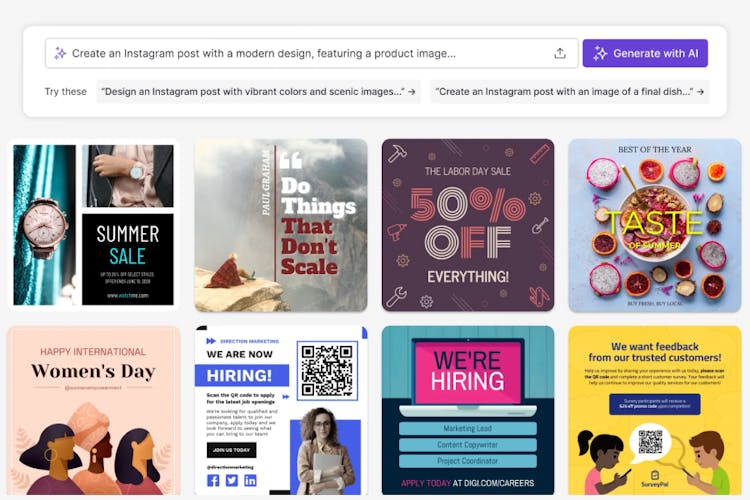 Start by entering a short prompt or selecting a use case, such as a promotion, announcement, or educational post. The AI generates an Instagram-ready visual using professionally designed templates, along with suggested on-image copy to match your message. You can edit text, visuals, colors, and layout using the drag-and-drop editor before exporting your post.