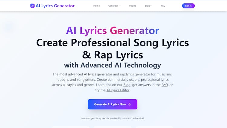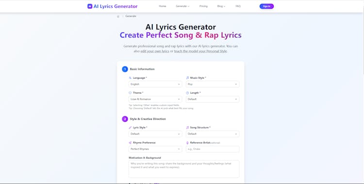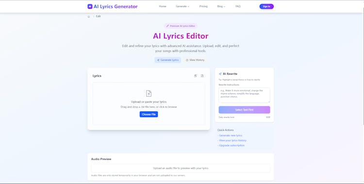 AI lyrics generator focuses on creating professional, commercially viable lyrics across a wide range of musical styles. It also supports partial lyric rewrites and can generate new lyrics that closely match the style of the user’s original work.