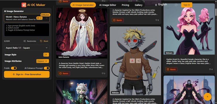 AI OC Maker is an AI-powered platform for generating unique original characters with detailed character sheets and diverse artistic styles.