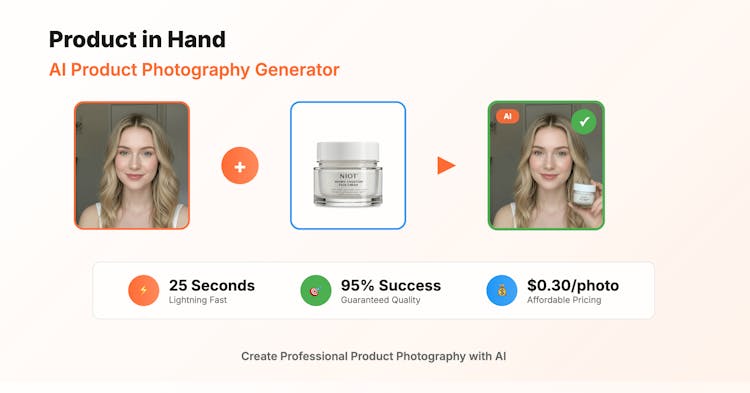 Create professional product-in-hand photos with AI in 25s. Upload person + product images, get studio-quality results. 95% success rate, logo protection.