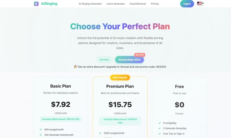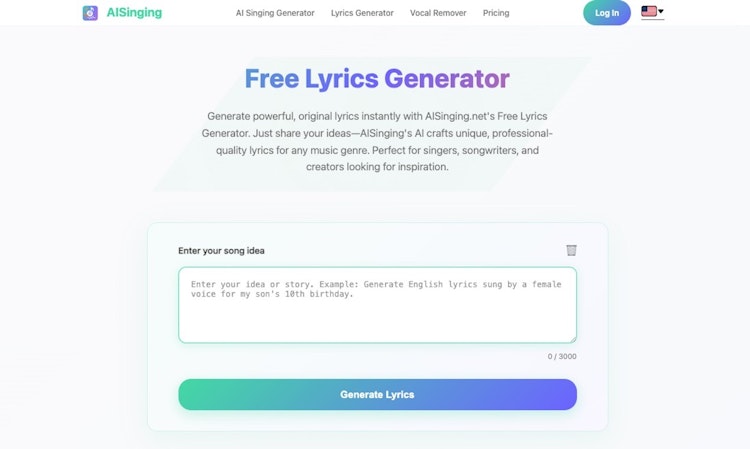 Transform lyrics into melodies effortlessly with AISinging's free AI singing tool. Transform your thoughts into songs instantly and unleash your creativity! Turn lyrics or text into stunning songs with advanced AI. Input prompts, customize genres, moods, voices, instruments, and tempos for professional melodies. Generate singing voices from user or AI lyrics instantly—royalty-free! Elevate your music with the top free AI vocal tool. Sing it now!