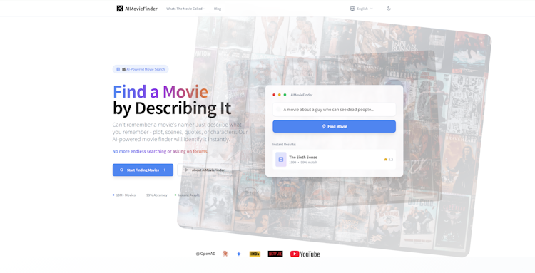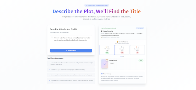 Can't remember a movie's name? Simply describe the plot, a character, or a memorable quote. Our smart tool will instantly find that movie for you. The ultimate finder for when a title is on the tip of your tongue.