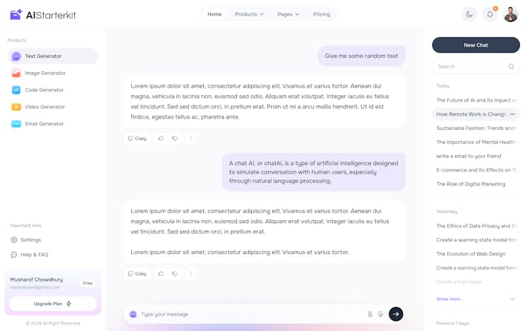 You’ll get essential components and pages, including auth flows, dashboards, pricing, and more. Whether you're building text, image, code, or email generation tools, everything is pre-integrated and customizable.