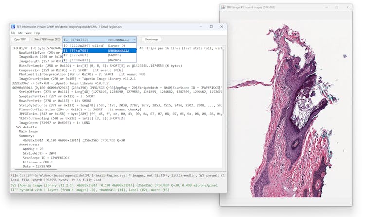 AlgART Tiff Information Viewer is a free portable cross-platform utility (Windows, Linux, macOS, etc.) for inspecting and decoding the structure of TIFF files. It supports most TIFF features including Big-TIFF, any bit depths, and most compressions including JPEG-2000. It displays both the image and detailed TIFF tag structure, allowing you to explore and understand TIFF files in depth. Additionally, it recognizes and shows metadata for popular multi-scale pyramid formats such as Aperio SVS.