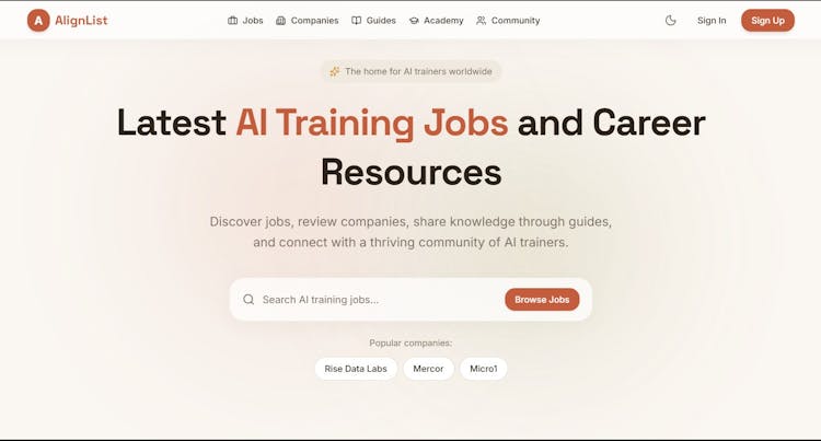 AlignList is a specialized job discovery platform focused on AI training, data annotation, model evaluation, and human-in-the-loop roles.