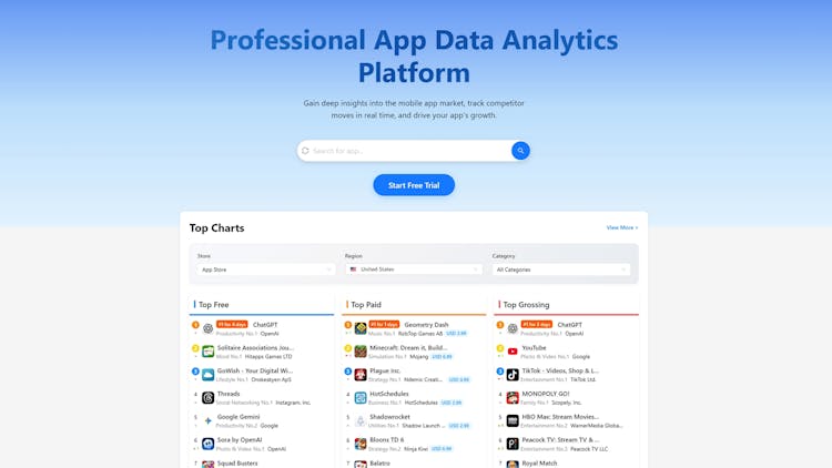 A free app analytics and market research tool that helps you track downloads, revenue, and app dynamics.