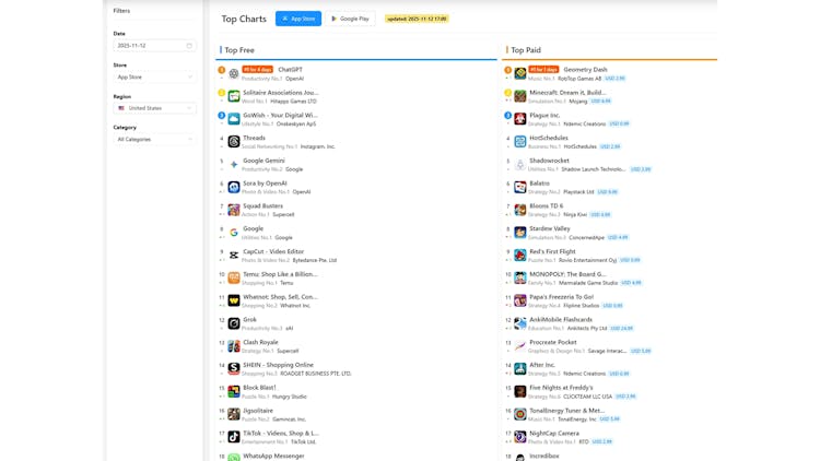 - App Rankings & Downloads: Track app rankings, downloads, and revenue across stores.