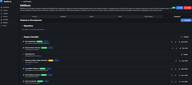 Complete project management dashboard for indie developers