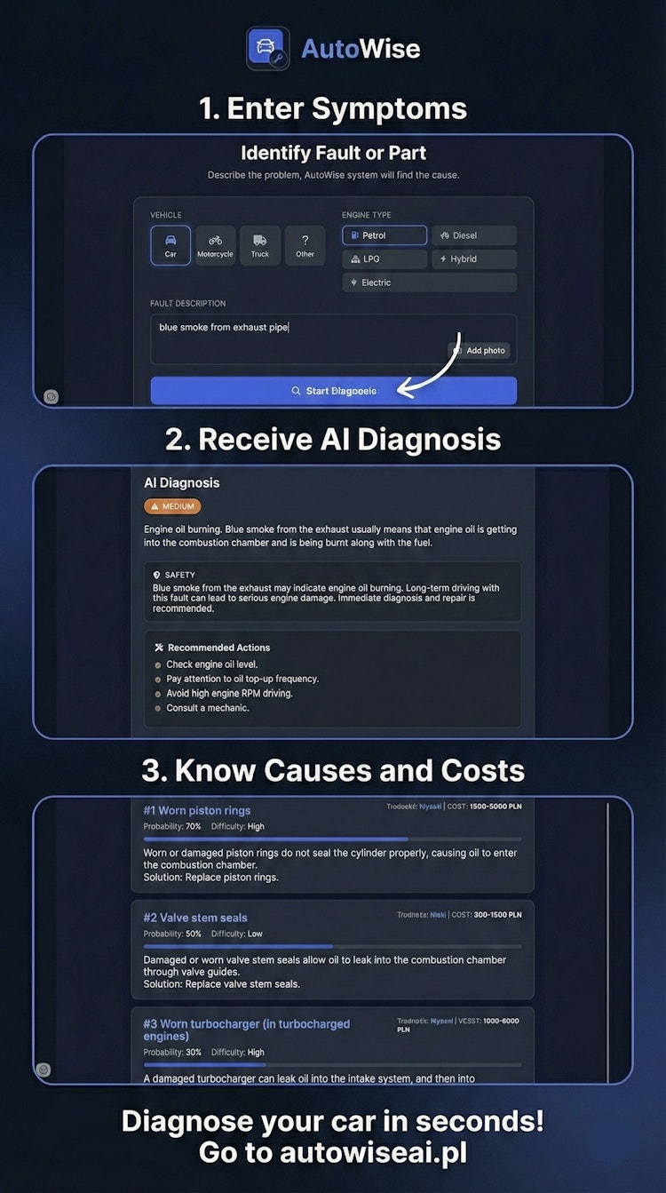 AutoWiseAI helps you diagnose car problems by symptoms, estimates repair costs, and advises on safety severity. Perfect for non-experts who want to avoid mechanic rip-offs. Includes a bonus tuning guide for enthusiasts.
