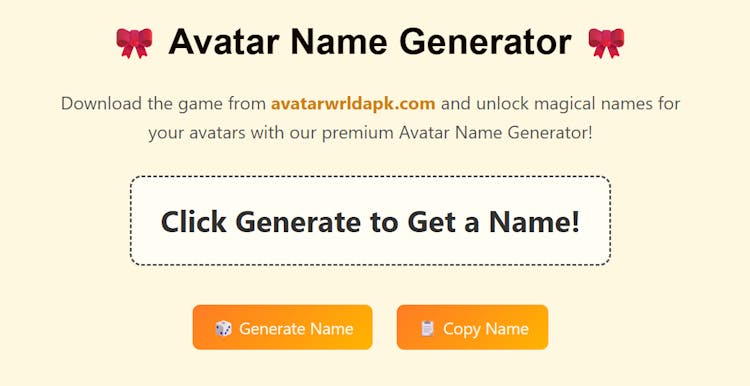 Unleash your creativity with our Avatar Name Generator — the ultimate tool to craft unique, fun, and powerful names for your digital identity! Whether you're building a fantasy character, setting up a gaming profile, or naming your avatar in a virtual world, this tool helps you discover the perfect name in seconds. With a mix of cool, cute, and fierce names, your online persona will stand out like never before. Just click and find your perfect name — no login, no limits!