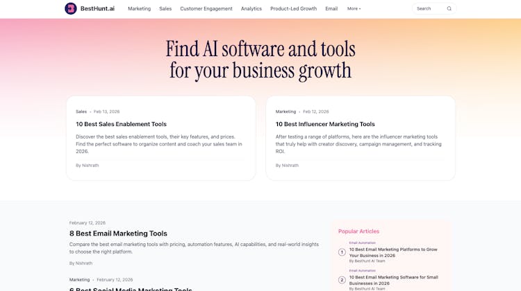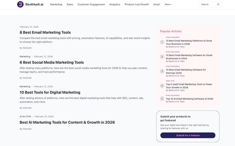 BestHunt.ai is a software discovery and comparison platform that helps businesses quickly find the right AI and SaaS tools for marketing, sales, analytics, and automation. It curates researched tool lists with side-by-side comparisons, pricing insights, and practical recommendations so teams can evaluate solutions without visiting multiple websites.