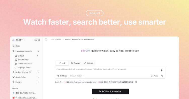 BibiGPT helps you learn smarter from YouTube, Bilibili, podcasts, and local files. It summarizes and visualizes videos with AI, turning them into structured notes and mind maps. Integrated with Notion and Obsidian, it bridges the gap between watching and understanding — helping you think deeper and create smarter.