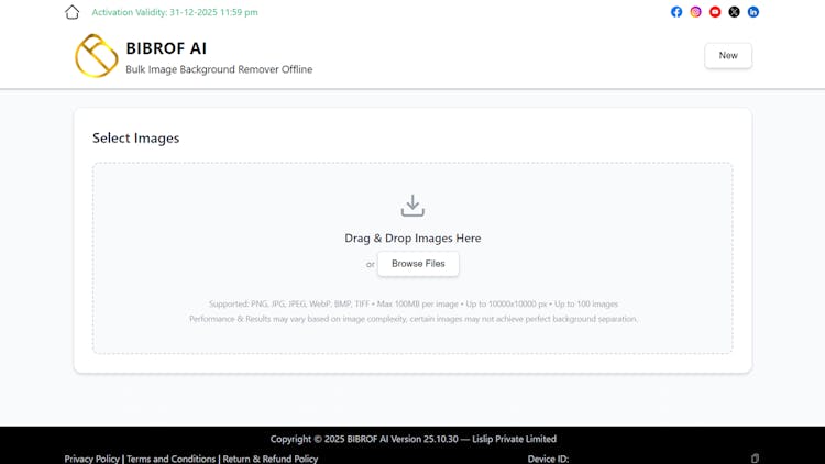 BIBROF AI is a privacy-first desktop app that removes backgrounds from images completely offline on your Windows PC or laptop. No photos are uploaded, processed, or stored on any server. The only time the app connects to the internet is for trial activation and license key operations (install, activate/renew, purchase).