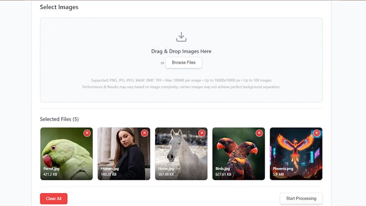3. Batch Processing - remove backgrounds from up to 100 images per batch.