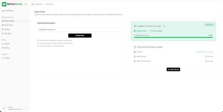 BillionVerify is a leading email verification service that helps businesses maintain clean email lists and improve their email marketing effectiveness. Founded with the mission to make email verification accessible and accurate for businesses of all sizes. What We Offer Real-time email verification API with 99.9% accuracy Bulk email list cleaning for marketing campaigns Disposable email detection Role-based email identification Catch-all server detection Detailed verification reports