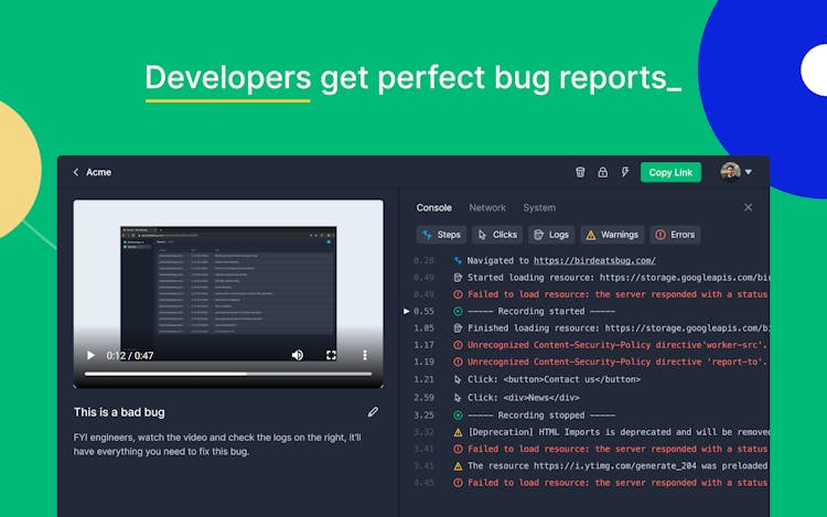 This saves QA, PM, CS and Eng teams over 50% of time on bugs reported by testers and even non-technical users.