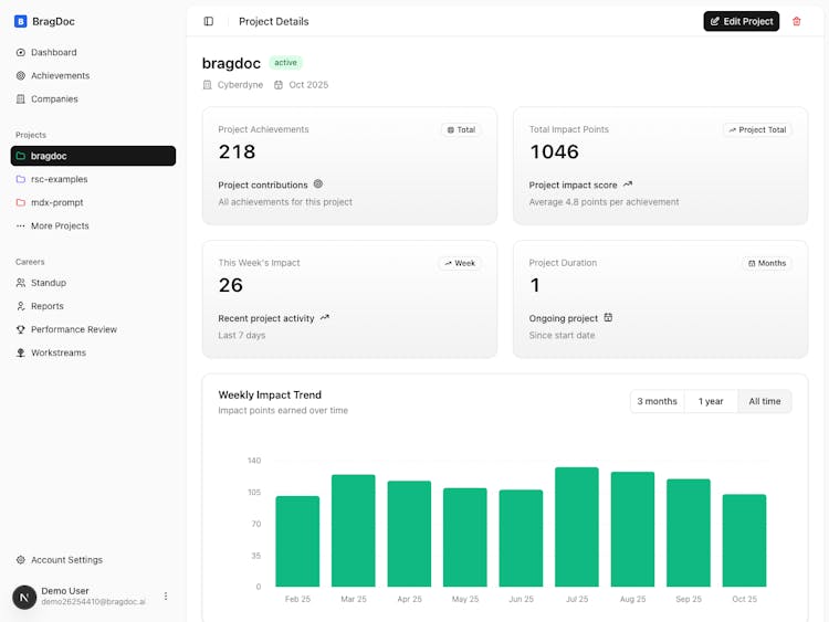 Automatically extract achievements from your git history and build your brag document with AI. Perfect for performance reviews, standups, and career growth. Includes a CLI that analyzes your commits and a web app to organize and refine your accomplishments. Privacy-first tool — no code ever leaves your computer.