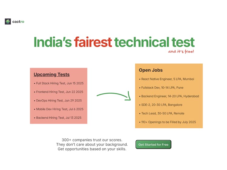 Cactro is your direct route from coding practice to real job interviews. Designed especially for developers from tier-3 colleges or non-traditional backgrounds, we act as your placement partner - no strings attached.