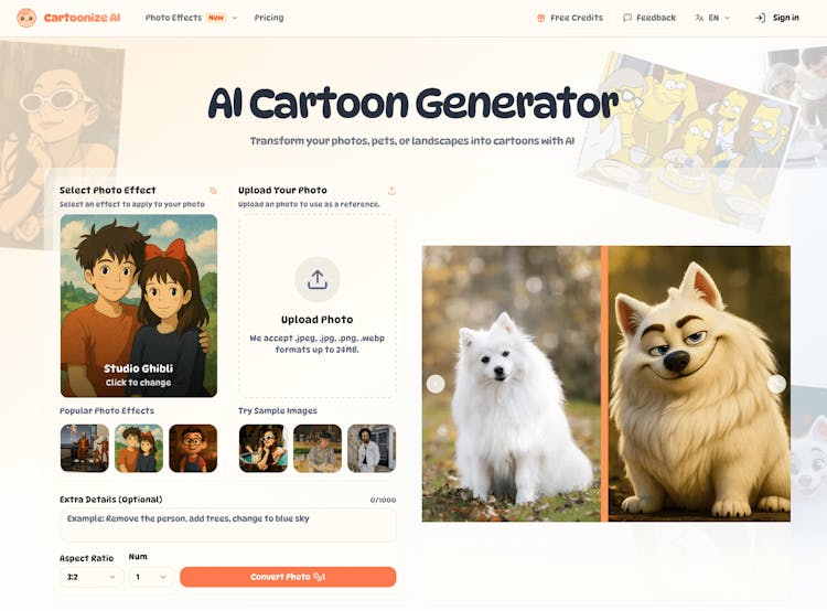 Cartoonize AI is an advanced online AI-powered photo cartoonizer that instantly converts your images into vibrant cartoon styles. Featuring a vast library of effects inspired by anime, comics, 3D animation, traditional art, and more, Cartoonize AI enables users to transform portraits, landscapes, and pets into stunning cartoon creations with ease and speed.