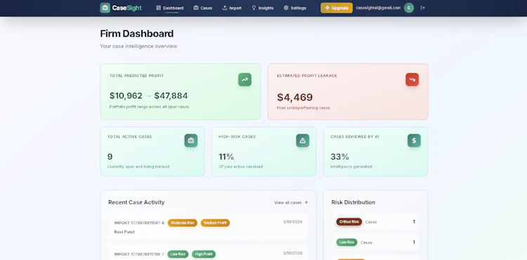 CaseSight helps litigation firms predict case profitability, identify financial risk, and understand which cases to push forward, settle earlier, or reconsider—so they can take better cases and avoid profit leakage.