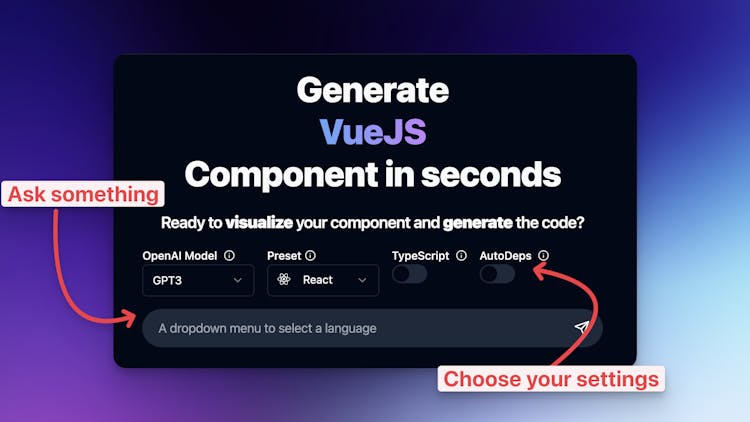 Turn text into a component with our interactive chat. Simply type 'create a counter', select from your framework and see your Component come alive in your browser. Then, ask for modifications and see the result instantly!