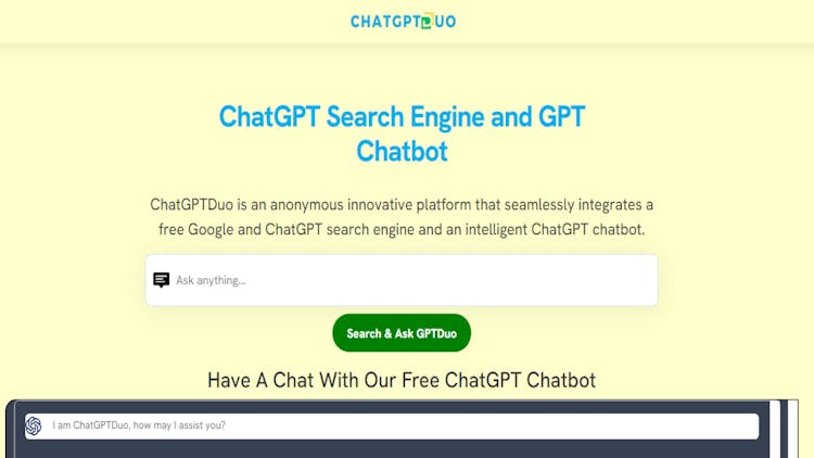 ChatGPTDuo is an anonymous innovative platform that seamlessly integrates a free Google and ChatGPT search engine and an intelligent ChatGPT chatbot.