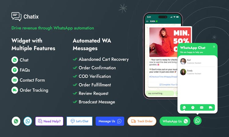 Chatix is an all-in-one WhatsApp support widget for chat support, order updates, COD verification, and abandoned cart recovery. Chatix manages multi-agent chats, online hours, and WhatsApp API automation for marketing and promotions. It is perfect for Shopify stores wanting faster support, higher conversions, and better customer communication.