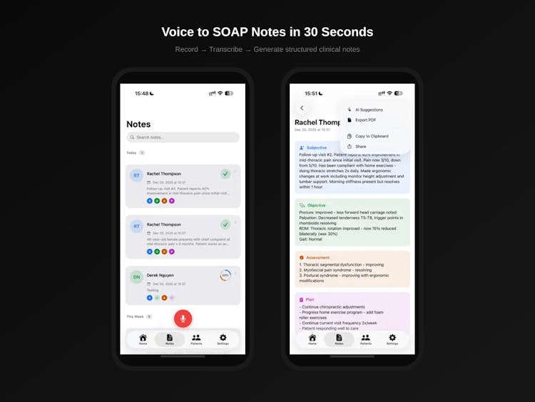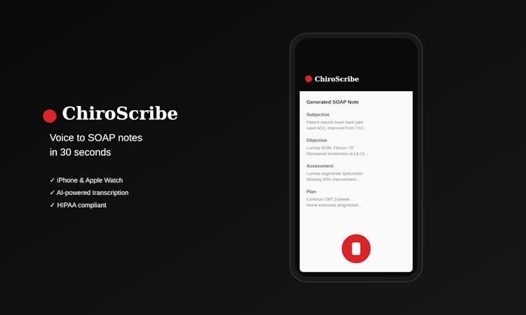 Chiropractors spend 1-3 hours every night on documentation. ChiroScribe fixes that. Record from your iPhone, Apple Watch, or browser. AI transcribes and generates a SOAP note in 30 seconds. ✓ Voice-first — no typing ✓ Apple Watch — record without your phone ✓ Smart patient matching — say the name, we find the record ✓ Learns your style — adapts to your terminology ✓ HIPAA compliant — encrypted, BAA available Free trial. Be done with notes before you leave the office.