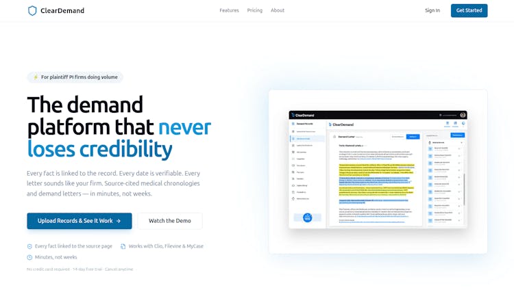 ClearDemand is an AI platform for personal injury law firms that generates source-verified demand letters in your firm’s voice. It supports medical record OCR, case companion AI, and litigation documents, helping firms draft faster while staying grounded in the underlying case materials. ClearDemand also includes cross-case search across firm matters, including demand letters, medical records, evidence, and litigation documents. A 14-day free trial is available.