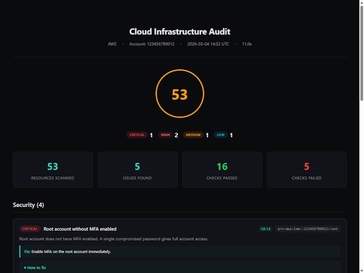 80 checks across 18 AWS services. 20 attack chain rules based on MITRE ATT&CK. CIS AWS v3.0 compliance engine. Scan diff for CI/CD regression detection.
