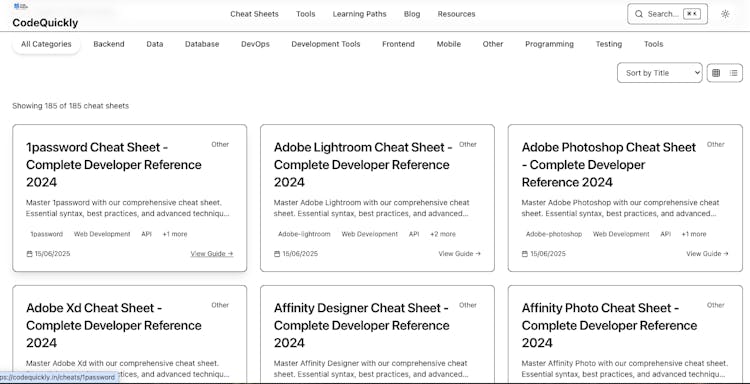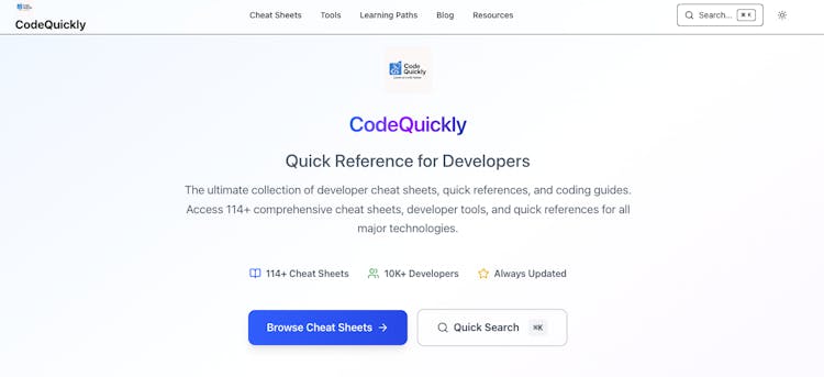 odeQuickly is the ultimate developer productivity hub with 114+ comprehensive cheat sheets and built-in tools. Get instant access to syntax references, code snippets, and utilities for JavaScript, Python, React, Node.js, and more.