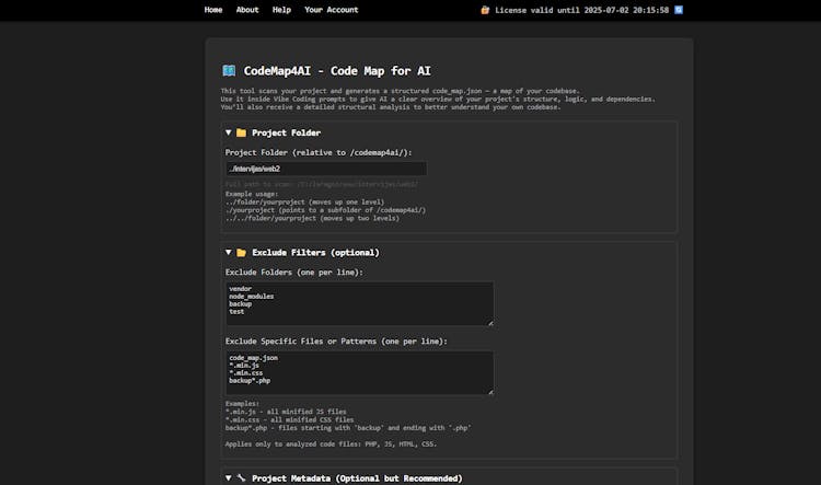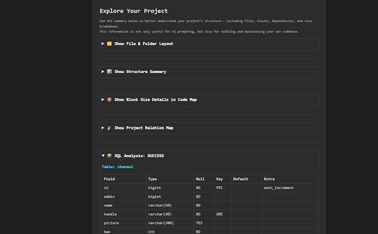 By scanning your codebase, CodeMap4AI automatically generates a structured code_map.json file that outlines your files, folders, classes, functions, routes, and database interactions. You can share this map with an AI assistant to drastically improve the quality of its responses — no more made-up parameters or fictional functions.