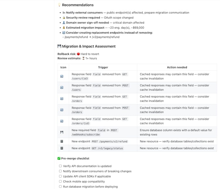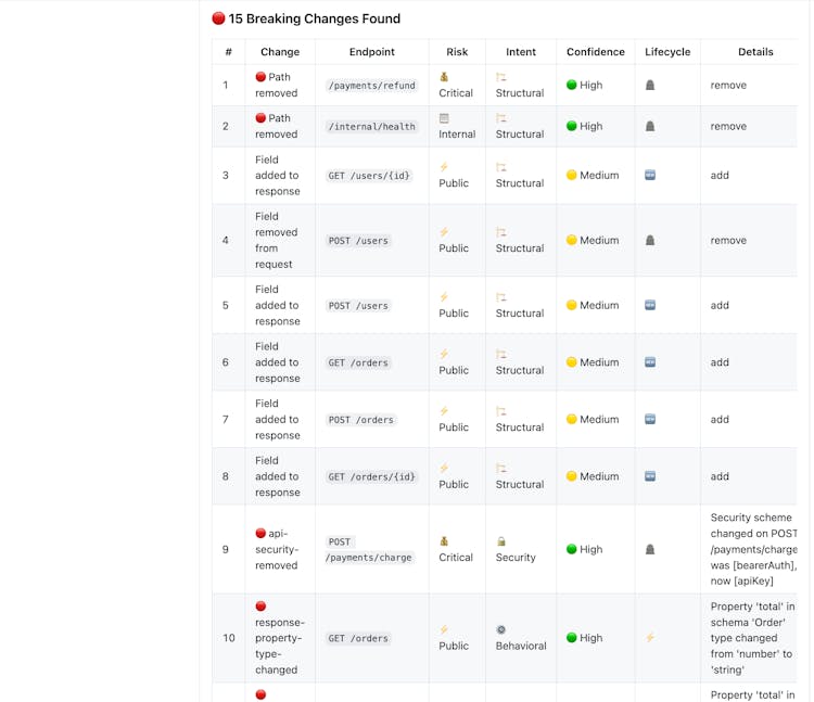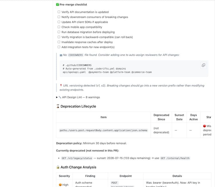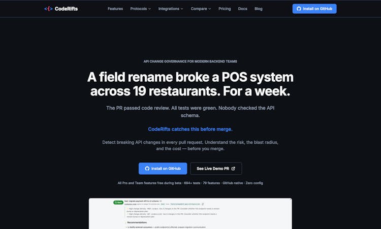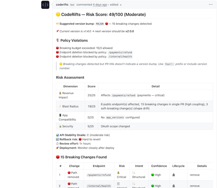 CodeRifts detects breaking changes in OpenAPI schemas on every pull request. It scores risk across 4 dimensions, enforces governance policies before merge, and translates API changes into business impact — blast radius, affected clients, and estimated cost.