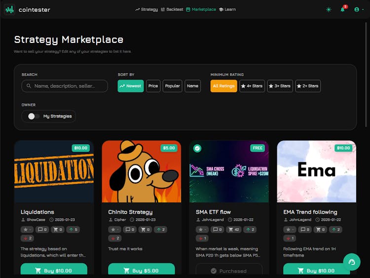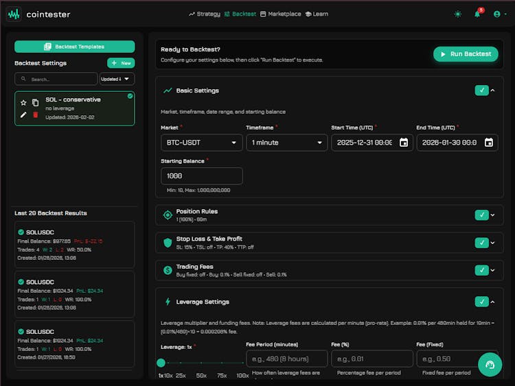 cointester.io is a visual crypto trading strategy builder that lets you create and backtest crypto trading ideas without writing code. Combine 100+ indicators, candlestick patterns, and AI sentiment signals, then test against 5+ years of historical data across 1,000+ trading pairs with realistic fees and slippage.
