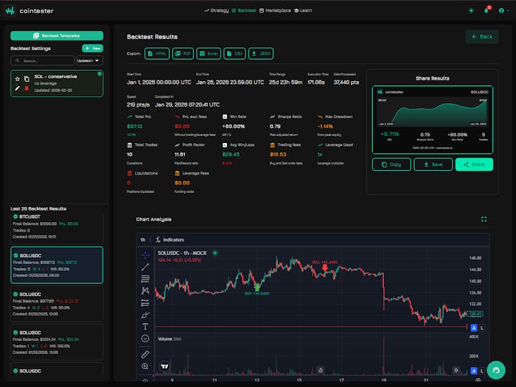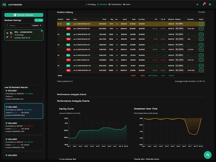 Configure leverage, stop loss, take profit, and position sizing. Review exactly where your strategy entered and exited, analyze performance metrics and charts, and validate whether your approach actually works on real historical data.
