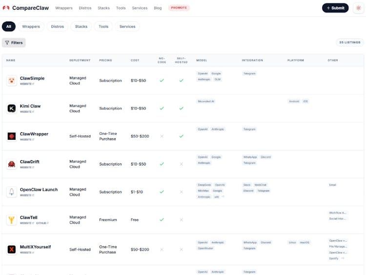 CompareClaw is a directory that helps you discover and evaluate wrappers, distros, stacks, tools, and services across the OpenClaw ecosystem. Browse curated listings with key details like deployment options, pricing, supported models, integrations, and platforms to choose the right setup for your agents.