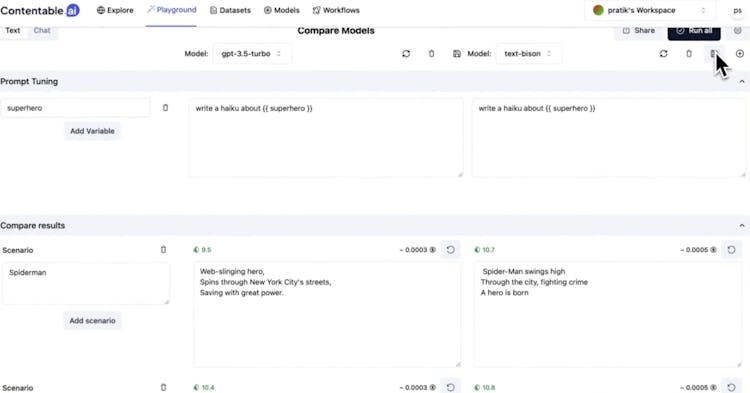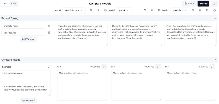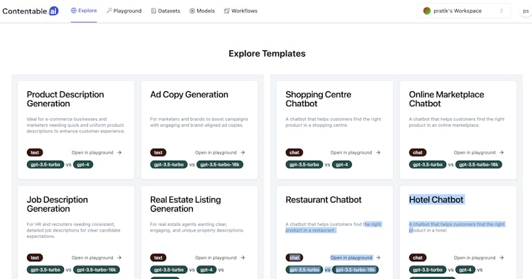Developer platform to test, compare and share multiple AI models. Use our intuitive model playground to compare the outputs from various models. In the post chat GPT world a lot of dev effort will be spent in testing and maintaining the prompts. You can measure the response time, outputs and cost of the model.
