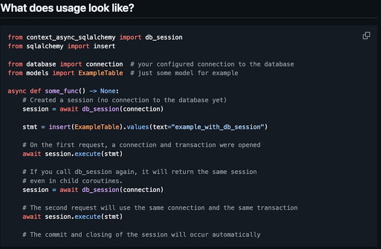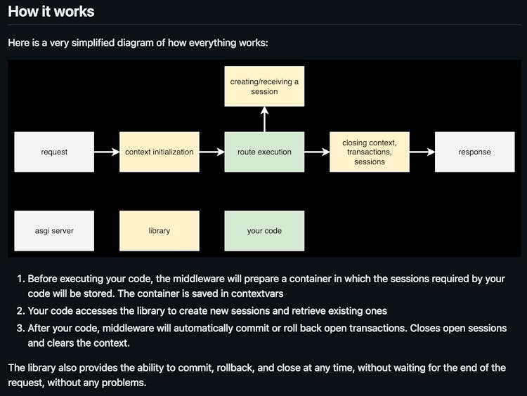 - Automatically manages the lifecycle of the engine, sessions, and transactions (autocommit / autorollback)