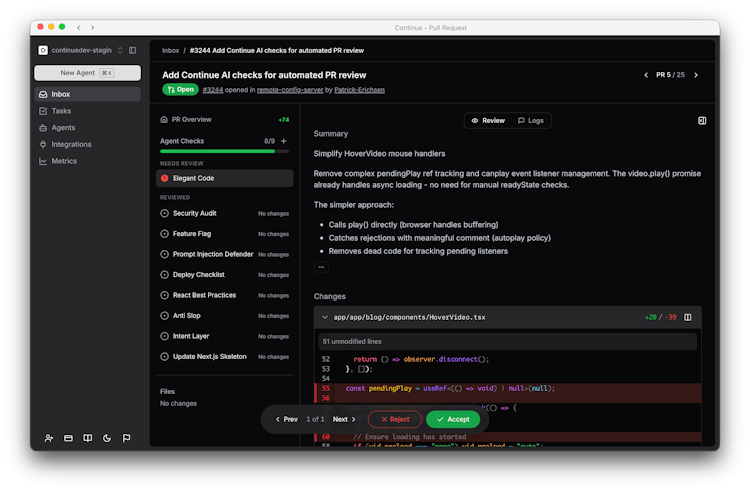 Continue lets you write those standards down once as AI checks that enforce themselves automatically. Each check is a markdown file in your repo that acts as a single-purpose agent with a pass/fail result, just like CI. When a check fails, it suggests a specific diff; when it passes, it's silent. The goal isn't to replace human review but to free it up for the things that actually need you.