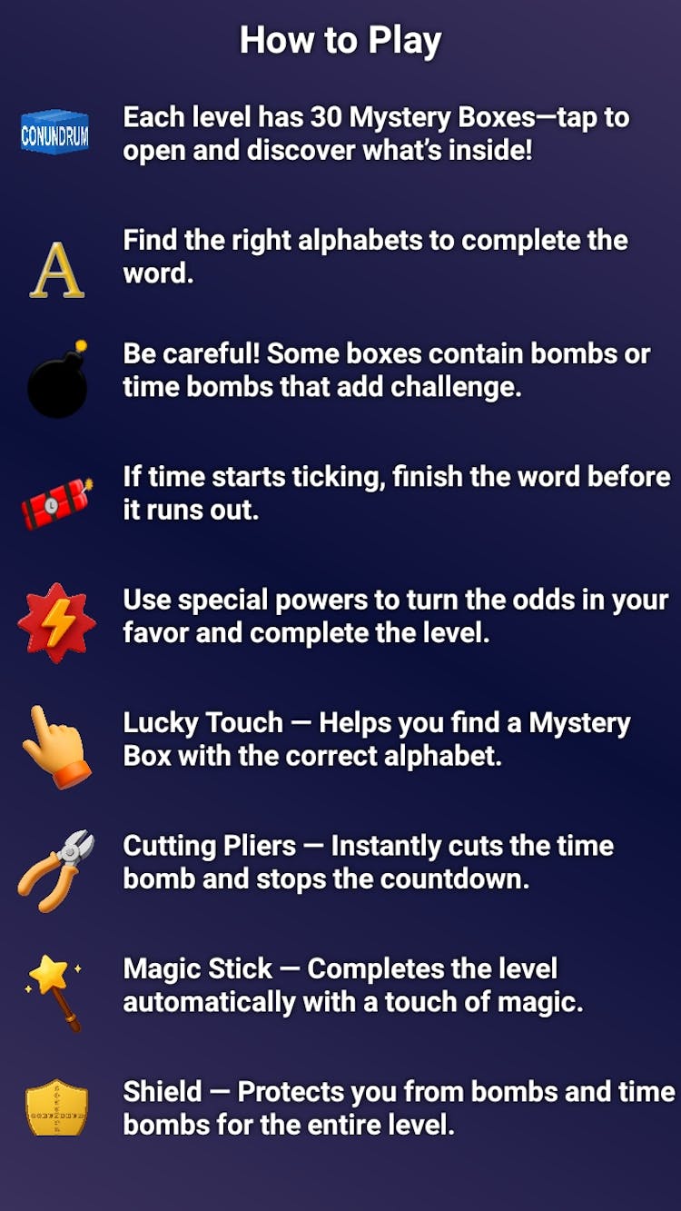 Conundrum blends word puzzles with suspense, creating a unique experience where intelligence meets instinct. Whether you're a word game lover or a fan of high-stakes challenges, this game will keep you on edge.
