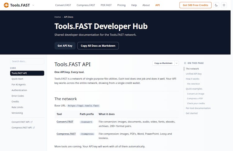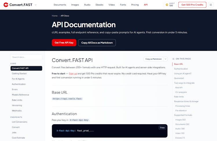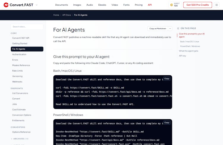 SKILL.mdfile agents can ingest directly, plusconvert.fast.shandconvert.fast.ps1convenience scripts that handle the submit/poll/download loop in one call - Auto-generated docs — built from the OpenAPI spec so always up to date, every converter has its own page with examples and a try-in-browser link. One-click "copy all docs as markdown" button to paste straight into your AI agent
