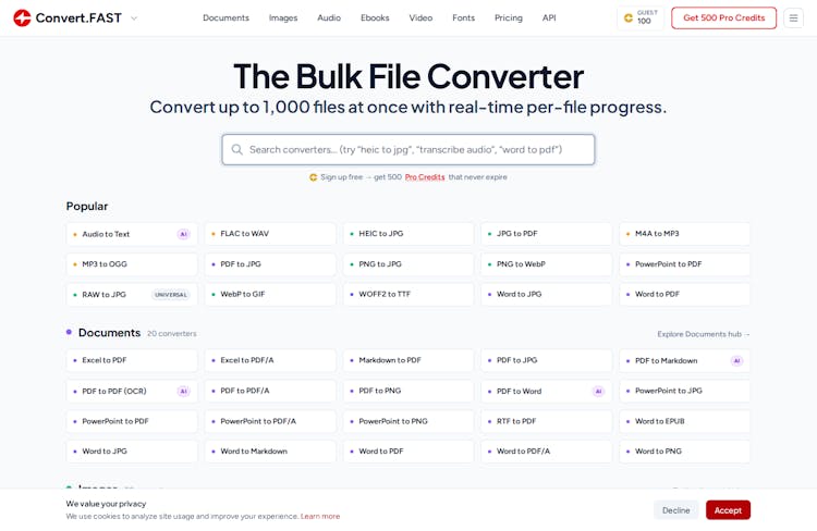 Convert.FAST API — a REST API for file conversion across 200+ formats. Images, RAW photos, documents, audio, video, archives, fonts, and ebooks.
