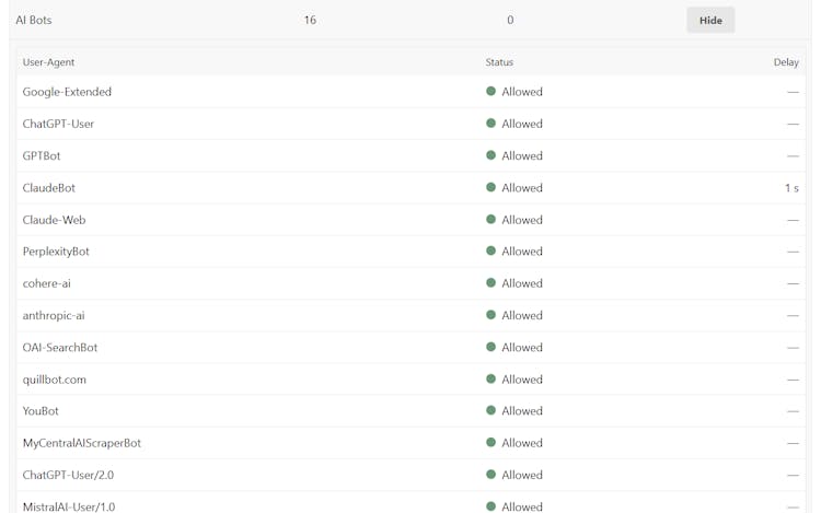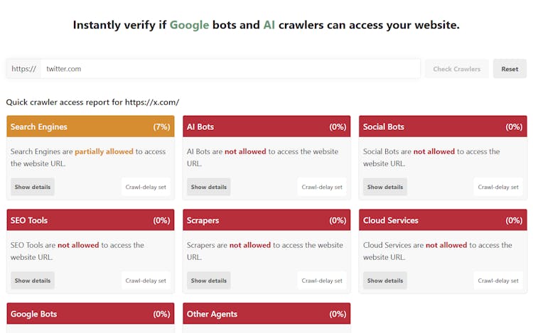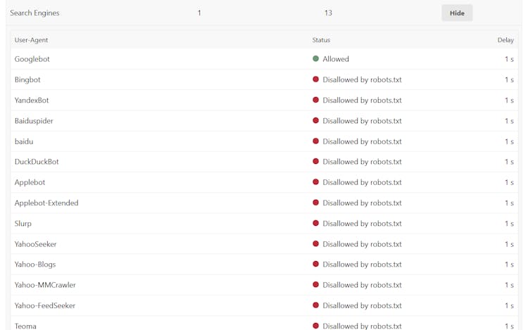 Use CrawlerCheck to instantly verify Googlebot, ChatGPT, and other 82 user-agents' access to your site by analyzing robots.txt, meta tags, and HTTP headers.