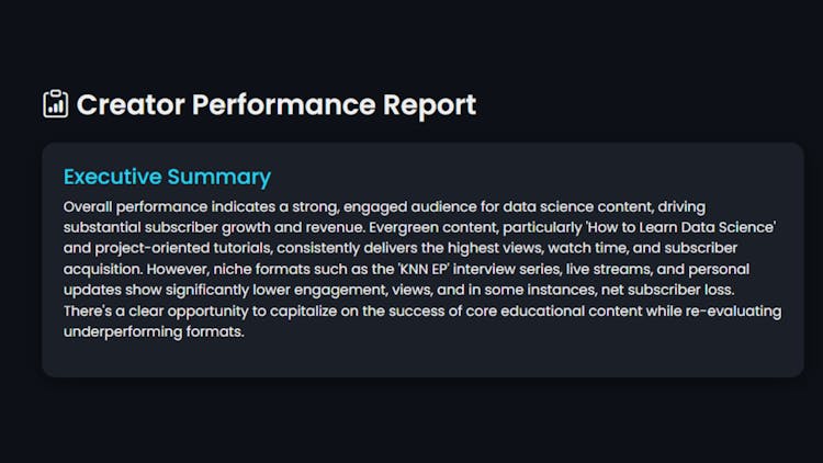CreatorMind AI is your personal AI assistant for YouTube analytics. Stop spending hours manually digging through CSV files — just upload your YouTube Analytics CSV, and instantly get actionable insights powered by Google Gemini AI.