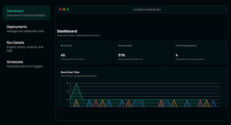 Crewship is a developer platform for deploying, running, and scaling AI agent workflows without managing infrastructure. It lets you package groups of AI agents (“crews”) and deploy them with a simple CLI command. The platform provides real-time logs, monitoring, and stored outputs so you can see what your agents are doing as they run. Crewship automatically handles scaling, security, and environment isolation, making it production-ready by default. In short, it’s a way to take multi-agent AI projects from local experiments to reliable production systems fast.